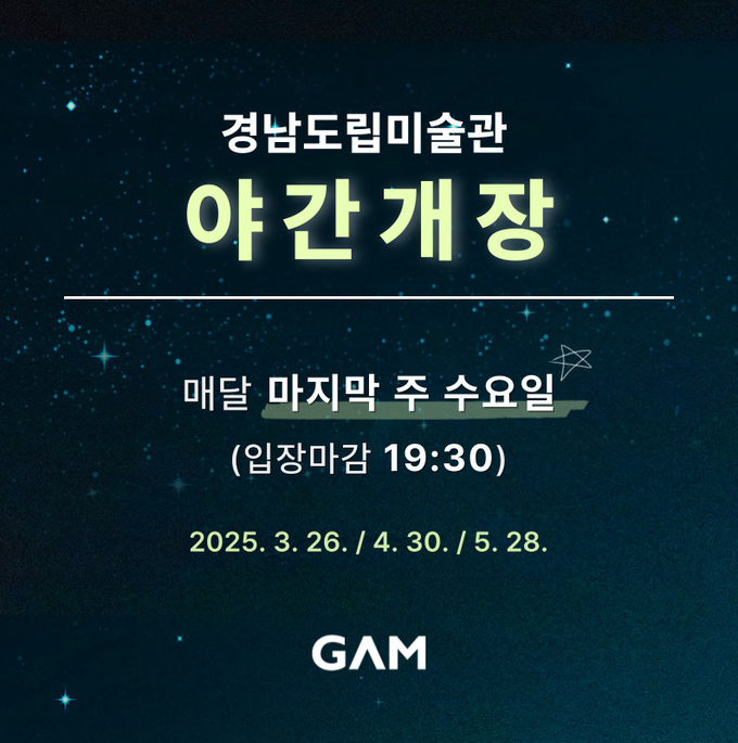 [경남도민뉴스=구인애 기자] 경남도립미술관은 오는 26일부터 매달 마지막 주 수요일 ‘문화가 있는 날’에 ‘야간개장’을 시작한다고 밝혔다.