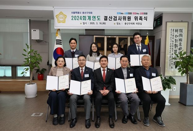 [경남도민뉴스=김완호 기자] 서울특별시 용산구의회가 3월 18일 의장실에서 2024회계연도 결산검사위원 위촉장 수여식을 진행했다.