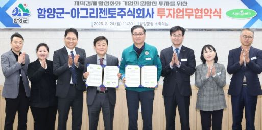 [경남도민뉴스=장광동 기자] 함양군은 3월 24일, 케미컬 제품(식물보호제) 생산기업인 아그리젠토 주식회사와 양자 간 투자협약(MOU)을 체결했다.