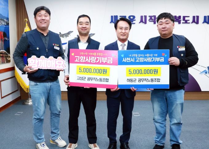 지난 24일 사천시(지부장 조현찬)·고성군(지부장 천재호)·하동군(지부장 정석문) 공무직노동조합원들이 사천시청을 방문하여 각 지부별로 500만원씩, 총 1000만원의 기부금을 전달했다.