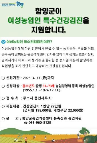 [경남도민뉴스=장광동 기자] 함양군은 여성농업인의 농작업 질환 예방과 건강복지 증진을 위해 ‘2025년 여성농업인 특수건강검진’ 사업을 추진한다.