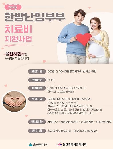 울산시 관계자는 “한방 난임 치료비 지원사업을 통해 난임으로 고통받고 있는 가정에 임신의 가능성을 높여 행복과 출산율 증가로 이어질 수 있기를 기대한다”라고 말했다.