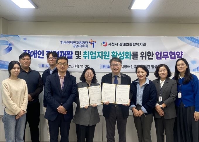 [경남도민뉴스=변정형 기자] 한국장애인고용공단 경남서부지사와 사천시 장애인종합복지관이 지난 25일 장애인의 직업재활과 취업지원 활성화를 위해 업무협약(MOU)을 체결했다.