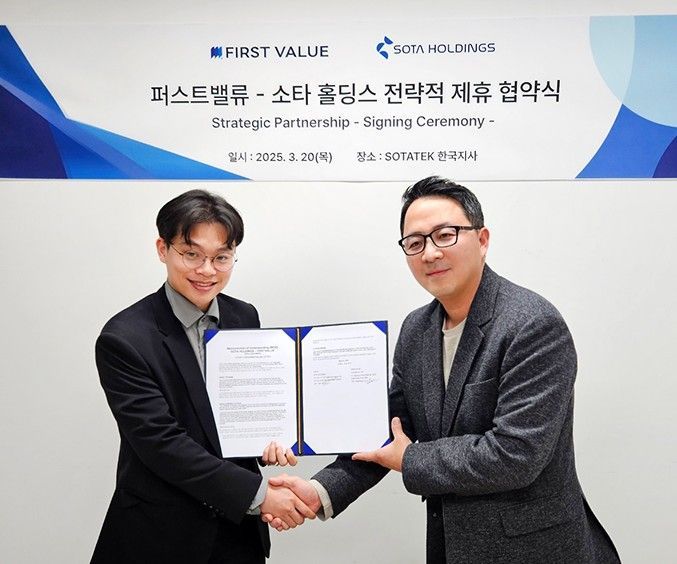 지난 20일 열린 협약식에는 퍼스트밸류 송봉호 대표, 소타 홀딩스 한국지사 소타텍 코리아 대표 James Le 등 주요 관계자들이 참석한 가운데 소타텍 코리아 사무실에서 진행됐다.