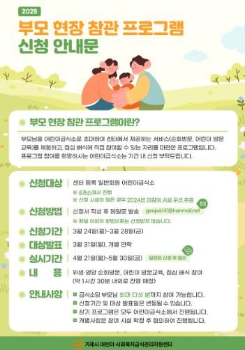 신청은 3월 24일부터 3월 28일까지 센터 메일을 통해서 받으며, 자세한 내용은 거제시 어린이·사회복지급식관리지원센터 홈페이지 또는 블로그에서 확인할 수 있다.