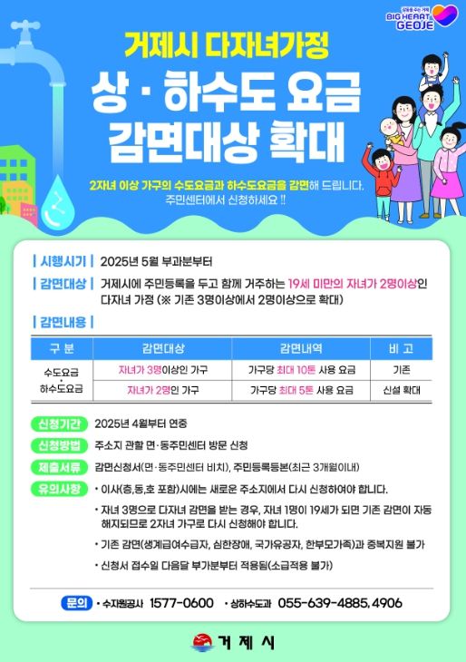 [경남도민뉴스=김부경 기자] 거제시는 ‘거제시 수도급수 조례’ 및 ‘거제시 하수도사용 조례’개정에 따라 다자녀 가정의 상하수도요금 감면 대상을 3자녀에서 2자녀로 확대한다고 밝혔다.