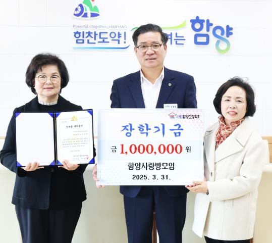 함양사랑방모임은 3월 31일 지역 청소년들을 위한 장학금 100만 원을 (재)함양군장학회에 기탁했다.