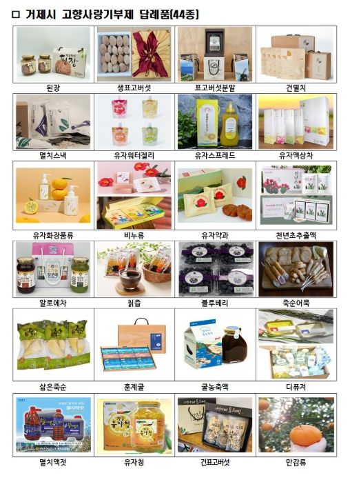 이번 선정된 답례품 및 공급업체는 △거송향버섯(생표고버섯, 표고버섯분말) △시영아빠표고버섯(건표고버섯) △연초농업협동조합(멸치액젓, 유자청) △거제도외포멸치(건멸치, 멸치스낵) △거제축산업협동조합(한우, 한돈) △여차갯닦이미역(돌미역) △거제블루팜(블루베리) △올담농원주식회사(히카마 가공식품) △(주)거제전통메주(된장) △행복앤거제천년초(천년초추출액) △거제알로에팜(알로에차) △칡즙(거제도칡즙) △수피랑(워터젤리, 유자스프레드, 유자액상차) △거제유자바다(유자푸딩, 유자티백, 공유단) △산길주식회사(유자드레싱, 수제양념장) △산속농장주식회사(삶은죽순, 죽순어묵) △주식회사온더선셋(유자관련화장품류, 비누류, 유자약과) △휴데이(비누류, 디퓨저) △대일씨에프(훈제굴, 굴농축액) △성포양조장(전통주) △거제오란다(강정류) △거제케이블카주식회사(케이블카탑승권) △지석농장(만감류, 산딸기, 산딸기잼)이다.