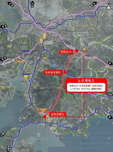 사천우주항공 고속국도는 총사업비 1조 3954억 원, 연장 18.3km의 왕복 4차선 규모로 추진되는데, 연화산JC에서 삼천포항IC를 연결하는 100% 국비 사업이다.