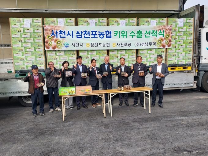 사천시농업기술센터, 농협사천시지부, 삼천포농협, 수출업체 ㈜경남무역 관계자들과 삼천포농협키위공선회 농가들이 지난 28일 삼천포농협 키위공선장에서 선적식을 하고 20톤을 일본으로 수출했다.