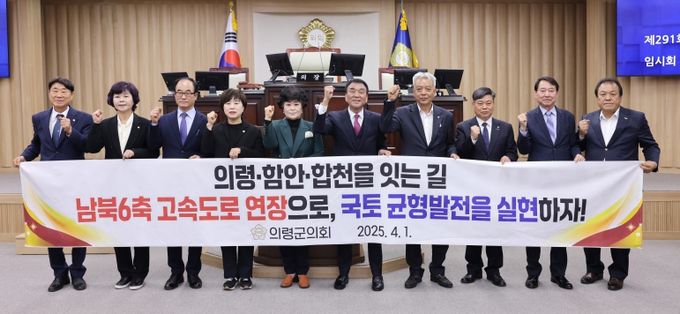 [경남도민뉴스=이상민 기자] 의령군의회는 1일 제291회 임시회를 열고 경남 내륙 지역 발전과 국가 경쟁력 강화를 위해 ‘남북6축 고속도로 합천-의령-함안 구간 연장을 위한 건의안’을 채택, 국회와 정부에 촉구했다. 이번 건의안은 남북6축 고속도로의 연장을 제2차 국가도로망종합계획의 수정에 반영하여 국토 균형 발전과 지역 소멸 위기 해소를 목표로 하고 있다.