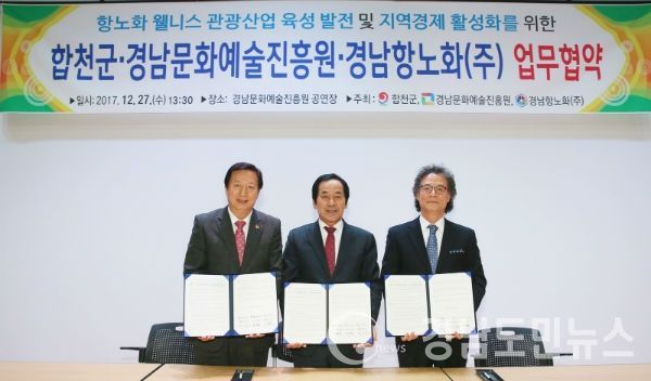 (합천/권연홍 기자) = 합천군(하창환 군수)과 경남문화예술진흥원(원장 이성주) · 경남항노화 주식회사(대표이사 백상원)간에 항노화 웰니스 관광산업 육성 발전 및 지역경제 활성화 도모를 위한 상호 협력 협약식을 27일 경남문화예술진흥원에서 체결했다.