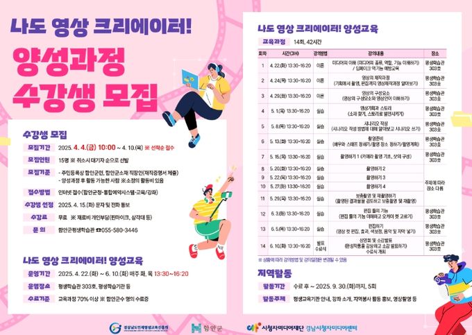 교육은 최신 미디어 트렌드를 반영한 실습 중심으로 운영되며, 영상 제작에 관심 있는 지역 주민들에게 실질적인 역량 강화의 기회를 제공할 것으로 기대된다.