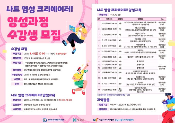 [경남도민뉴스=권중환 기자] 함안군은 평생학습 분야 영상활동가를 양성하는 ‘나도 영상 크리에이터’ 양성과정 수강생을 오는 4일 오전 10시부터 10일까지 선착순으로 모집한다.