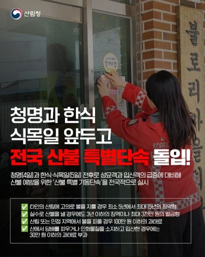 [경남도민뉴스=백형찬 기자] 청명(4일)과 한식·식목일(5일) 전후로 성묘객과 입산객의 급증에 대비해 산불 예방을 위한 '산불 특별 기동단속'을 전국적으로 실시