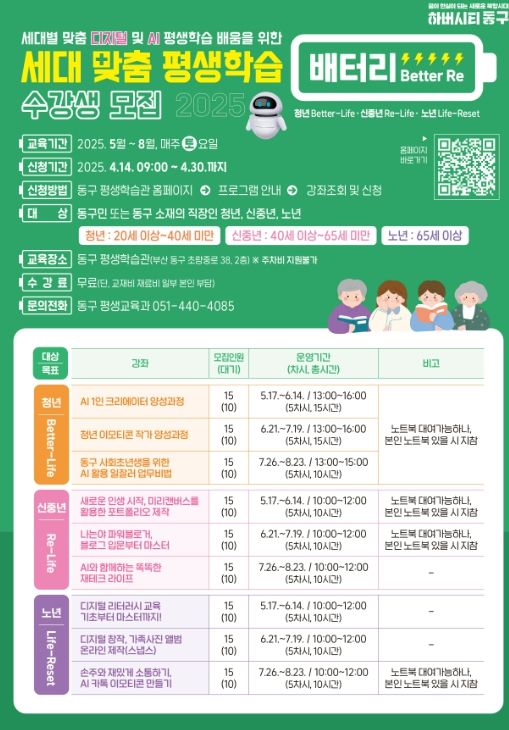 [경남도민뉴스=신석주 기자] 부산 동구는 세대 간 디지털 격차 해소를 위해 전문 디지털 및 인공지능(AI) 평생학습 사업인 ‘배터리(Better RE)’를 운영한다고 4일 밝혔다.