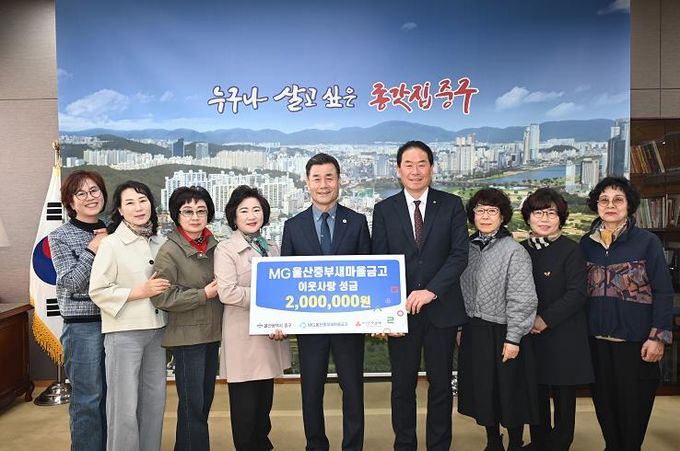 [경남도민뉴스=최재경 기자] MG울산중부새마을금고가 4월 4일 오후 3시 중구청 구청장실을 찾아 울산사회복지공동모금회를 통해 이웃돕기 후원금 200만 원을 전달했다.