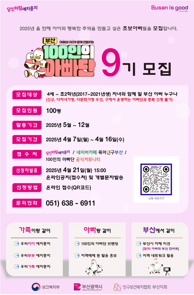 아빠단은 오는 5월 발대식을 시작으로 12월까지 활동하게 된다. 매월 '이달의 우수 아빠'를 선정하고, 보건복지부는 '분기별 최우수 아빠'를 선정해 시상할 예정이다. 지원 신청은 부산시 누리집 '당신처럼 애지중지'와 100인의 아빠단 공식 커뮤니티를 통해 가능하며, 선정 결과는 4월 21일 발표될 예정이다.