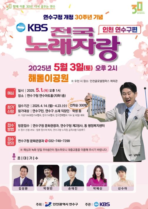 이번 전국노래자랑 본선 녹화는 오는 5월 3일 오후 2시 연수구 해돋이공원에서 진행되며, 우천 시에는 인천글로벌캠퍼스 체육관에서 개최된다.