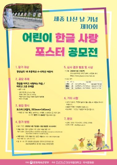 [경남도민뉴스=구인애 기자] 경상국립대학교(GNU) 국어문화원은 제628돌 세종 나신 날(5월 15일)을 맞이해 ‘제10회 어린이 한글 사랑 포스터 공모전’을 개최한다.