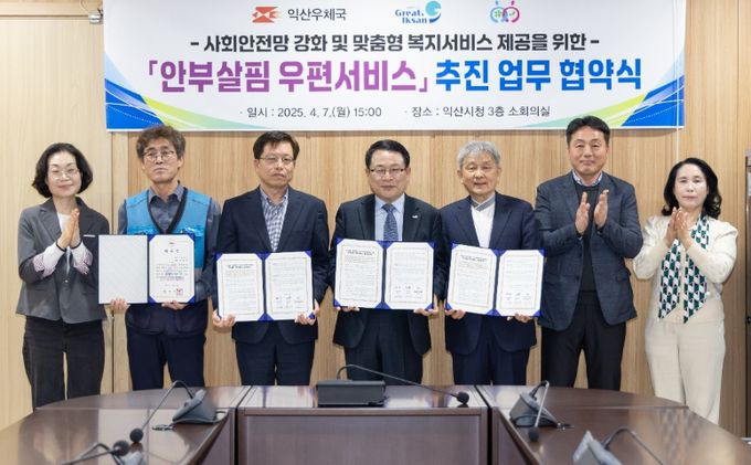 익산시는 7일 시청 소회의실에서 익산우체국, 익산시지역사회보장협의체와 함께 '안부살핌 우편서비스' 추진을 위한 업무협약을 체결했다.