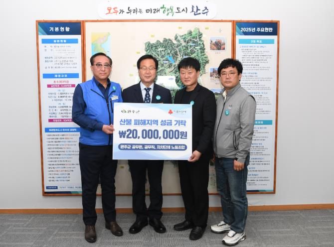[경남도민뉴스=최인태 기자] 완주군이 최근 대형 산불이 발생한 영남지역 등 주민들을 돕기 위해 공직자들의 성금 2,000만 원을 비롯해 총 1억여 원을 전북사회복지공동모금회를 통해 전달했다.