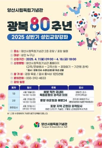 [경남도민뉴스=최미정 기자] 양산시립독립기념관에서 4월 18일부터 30일까지 총 3회에 걸쳐에 ‘광복 80주년 2025 양산시립독립기념관 상반기 성인교양강좌’를 실시한다고 밝혔다.