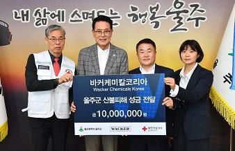 [경남도민뉴스=최재경 기자] (사)바커케미칼코리아가 7일 울주군청 소회의실에서 이순걸 군수, (사)바커케미칼코리아 장성민 울산 공장장 등 관계자들이 참석한 가운데 울주군 산불 피해 성금 1천만원을 전달했다.