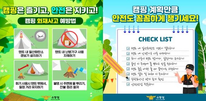 홍성소방서는 캠핑 시 화재를 예방하기 위한 방법으로 ▲캠핑장 주변 불법소각 금지 ▲가연물과 화기는 충분한 거리 두기 ▲텐트마다 소화기 비치 ▲타고 남은 불씨는 완전히 끄기 등을 준수해야 한다고 전했다.