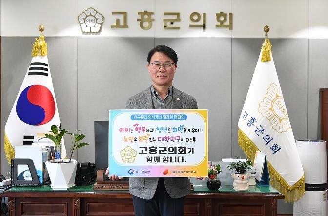 [경남도민뉴스=최인태 기자] 고흥군의회 류제동 의장이 지난 7일 인구감소와 고령화 문제로 인한 인구구조 변화의 심각성을 알리고, 국민들의 사회적 인식을 제고하기 위해 ‘인구문제 인식개선 릴레이 캠페인’에 동참했다.