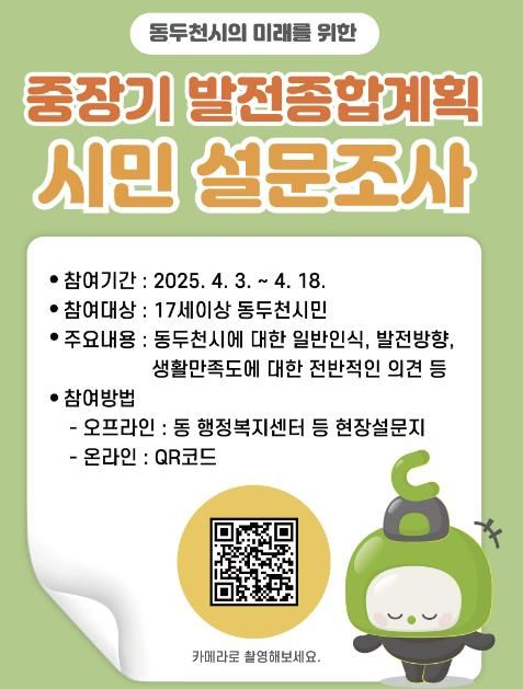 [경남도민뉴스=백형찬 기자] 동두천시는 시민의 목소리를 반영한 실효성 있는 도시 발전 전략을 마련하기 위해 ‘동두천시 중장기발전종합계획’ 수립을 추진 중이며, 이와 관련하여 시는 시민 의견을 적극적으로 반영하고자 오는 4월 18일까지 시민 대상 설문조사를 실시한다고 밝혔다.