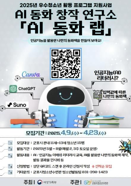 [경남도민뉴스=백형찬 기자] (재)군포시청소년재단 군포시청소년수련관은 군포시 관내 청소년의 AI 및 인공지능 리터러시 인식 증진과 AI 프로그램 활용 역량 향상을 위해‘AI 동화 창작연구소'AI 동화 랩'’프로그램 참가자를 모집한다.