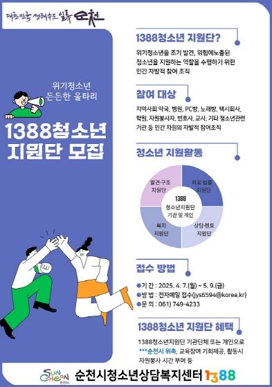 [경남도민뉴스=최인태 기자] 순천시 청소년상담복지센터는 위기청소년들의 촘촘한 사회안전망을 구축하기 위해 ‘1388 청소년지원단’을 모집한다고 밝혔다.