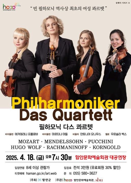 △실내악단 필하모닉 다스 콰르텟(4월 18일) 공연은 빈 필하모닉 역사상 최초의 여성 콰르텟으로 세계적인 실내악단이 선보이는 깊이 있는 연주, 정통 클래식 레퍼토리와 현대적인 감각을 접목한 연주로 관객들에게 특별한 감동을 선보인다.