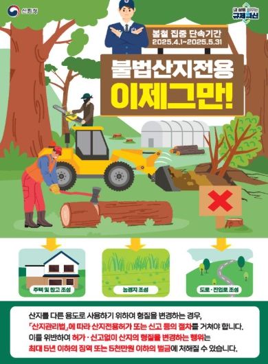 이번 단속은 △임산물 불법 굴·채취 △무허가 벌채 및 불법 형질 변경 행위 △산림 또는 인접 지역 내 불법 소각 △입산통제구역 무단 입산 등을 중점 대상으로 하며, 군은 현장 중심의 단속 강화를 위해 단속반을 편성해 운영할 계획이다.