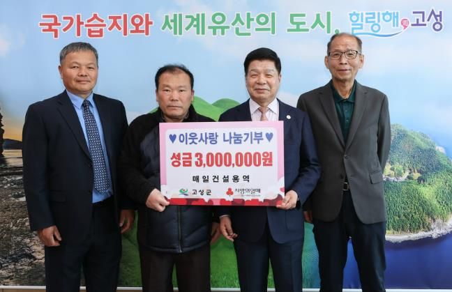 [경남도민뉴스=김태수 기자] 매일건설용역은 4월 8일 고성군청을 방문하여 어려운 이웃을 위해 성금 300만 원을 전달했다.