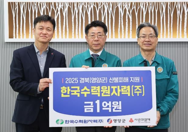 [경남도민뉴스=장강동 기자] 한국수력원자력(주)은 4월 9일 영양군청을 방문하여 오도창 영양군수, 경상북도 사회복지공동모금회 관계자가 참석한 가운데 산불 피해복구 성금 1억 원을 전달했다.