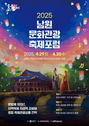 [경남도민뉴스=최인태 기자] 남원시는 대한민국 대표 전통축제 ‘춘향제’의 100년을 향한 여정 속에서, 오는 2025년 4월 29일(화)~30일(수), 켄싱턴리조트 지리산 남원 연회장 ‘새원’에서 ‘2025 남원 문화관광 축제포럼’을 개최한다.