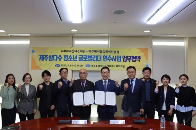 제주개발공사가 운영하는 재단법인 제주삼다수재단은 올해 재단 설립 20주년 및 제주개발공사 창립 30주년을 기념해 제주평생교육장학진흥원과 9일 ‘제주삼다수 청소년 글로벌 리더 연수사업’ 추진을 위한 업무협약을 체결했다고 밝혔다.