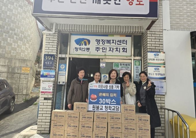 강정선 청학2동장은“매년 잊지 않고 이웃사랑을 나누어 주신 원불교 청학교당에 감사드리며, 기탁해 주신 김치는 따뜻한 마음과 함께 어려운 이웃들에게 잘 전달하겠다.”라고 감사의 마음을 전했다.