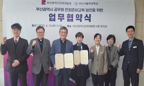 이번 협약은 공무원들의 은퇴 후 삶에 대한 체계적인 준비를 지원하기 위해 마련됐으며, 김은희 시 인재개발원장, 홍경완 부산가톨릭대학교 총장 등이 참석했다.