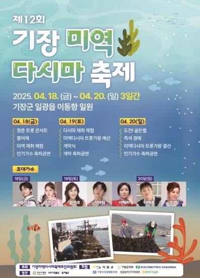 [경남도민뉴스=신석주 기자] 기장군은 오는 18일부터 20일까지 일광읍 이동항 일원에서 기장미역다시마축제추진위원회 주관으로 ‘제12회 기장미역다시마축제’를 개최한다고 11일 밝혔다.
