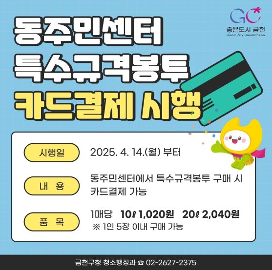 [경남도민뉴스=류종길 기자] 금천구는 동주민센터에서 특수규격봉투 신용카드 결제 서비스를 전면 시행한다고 밝혔다.