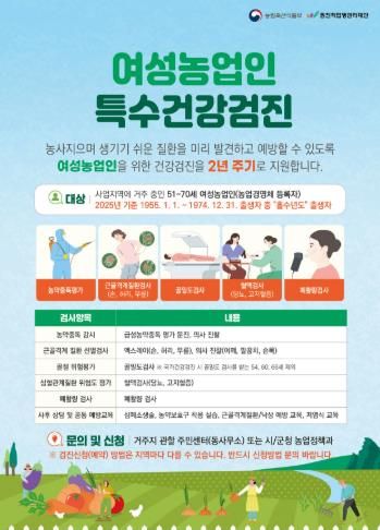 시 관계자는 “이번 사업이 농작업을 통해 발생하기 쉬운 질환을 조기에 발견하고 예방함으로써 여성농업인의 건강한 삶과 지속가능한 농업발전에 기여할 것으로 기대하고 있다”고 밝혔다.