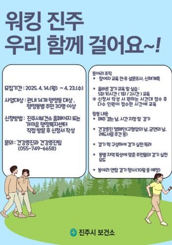 걷기 동아리 모집기간은 4월 14일부터 4월 23일까지이며, 진주시민 누구나 진주시보건소 누리집 또는 가까운 동행정복지센터에 신청서를 제출하면 된다.