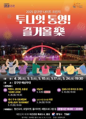 [경남도민뉴스=김부경 기자] 통영시는 ‘투나잇 통영! 즐거울 樂’을 오는 4월 26일부터 5월 24일까지 매주 토요일 밤, 총 5회에 걸쳐 강구안 해상무대 및 강구안 일원에서 개최한다.