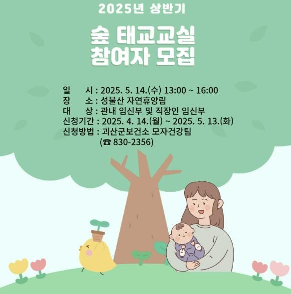 이번 프로그램은 오는 5월 14일 괴산군 대표 산림휴양시설인 성불산 자연휴양림에서 열리며, 군내에 거주하거나 직장을 둔 임신부라면 누구나 참여할 수 있다.