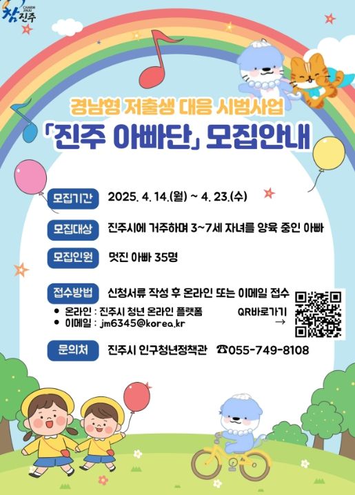 [경남도민뉴스=권중환 기자] 진주시는 4월 14일부터 23일까지 경남형 저출생 대응 시범사업의 일환인‘진주 아빠단’의 참여자를 모집한다.