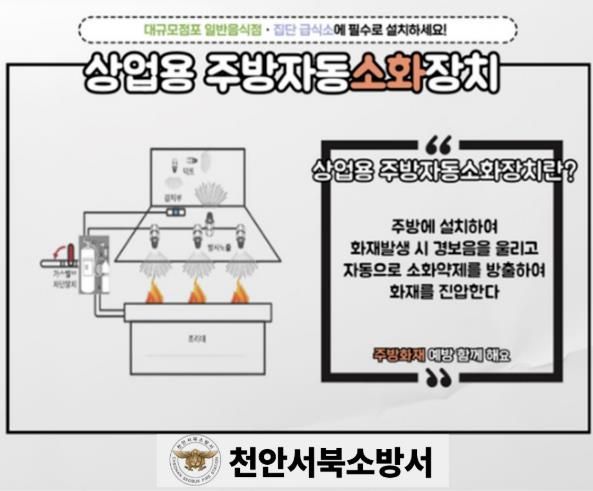 [경남도민뉴스=박만수 기자] 천안서북소방서는 대형 화재를 예방하기 위해 집단급식소, 대규모 점포, 일반 음식점 등을 대상으로 상업용 주방자동소화장치 설치를 적극 권장하고 나섰다.
