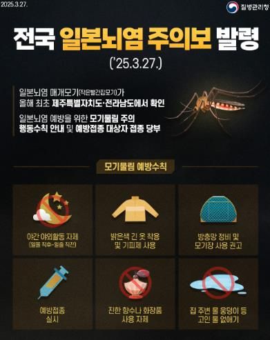 이번 일본뇌염 주의보는 제주특별자치도와 전라남도에서 일본뇌염 매개모기인 ‘작은빨간집모기’가 올해 처음 확인됨에 따라 발령된 것으로, 이는 전년도보다 3일 빠른 시점이다.